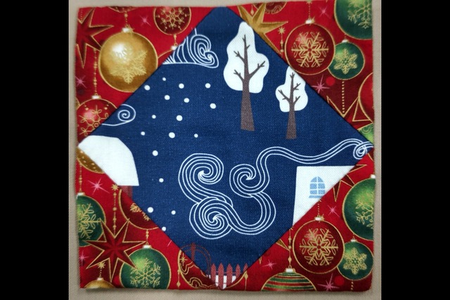 クリスマスに相応しいキルトです。 赤と緑の組み合わせが、ビビッドです。 大きさは、46×55cmです。 中に綿は入れていません。