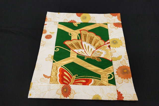 正絹の帯と着物地から制作しました。 「胡蝶」は、平家の家紋です。また、厳島神社は、平家が厚く崇敬しました。 その地に因んで、名前を付けました。 表面は胡蝶。 裏面は複数の着物地を組み合わせています。 50cm×45cmのフリークロスです。 中に綿は入れていません。
