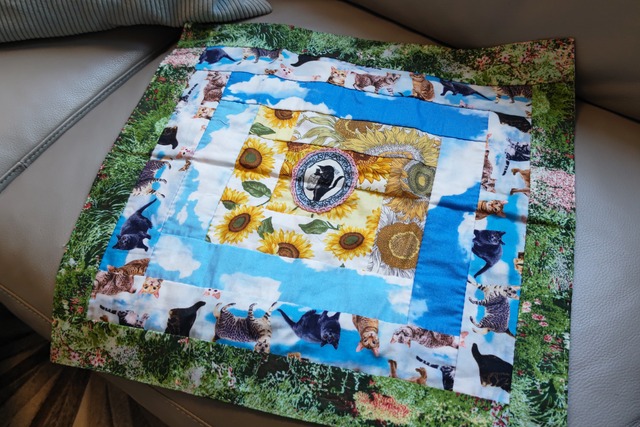 夏には、様々な伝統行事が行われます。 京都では、「大文字の送り火」の際、その時間帯、街中は極力、光を灯さないようにします。 そして、京都の五山を見上げつつ、故人を偲びます。 その時期に制作したキルトが、この「祈り」です。 可愛い猫柄ですが、そこに込められた意図は、今は亡き猫たちへの思いです 両面とも、綿です。 大きさは、48cm×50cmのやや小ぶりなフリークロスです。 中に綿は入れていません。
