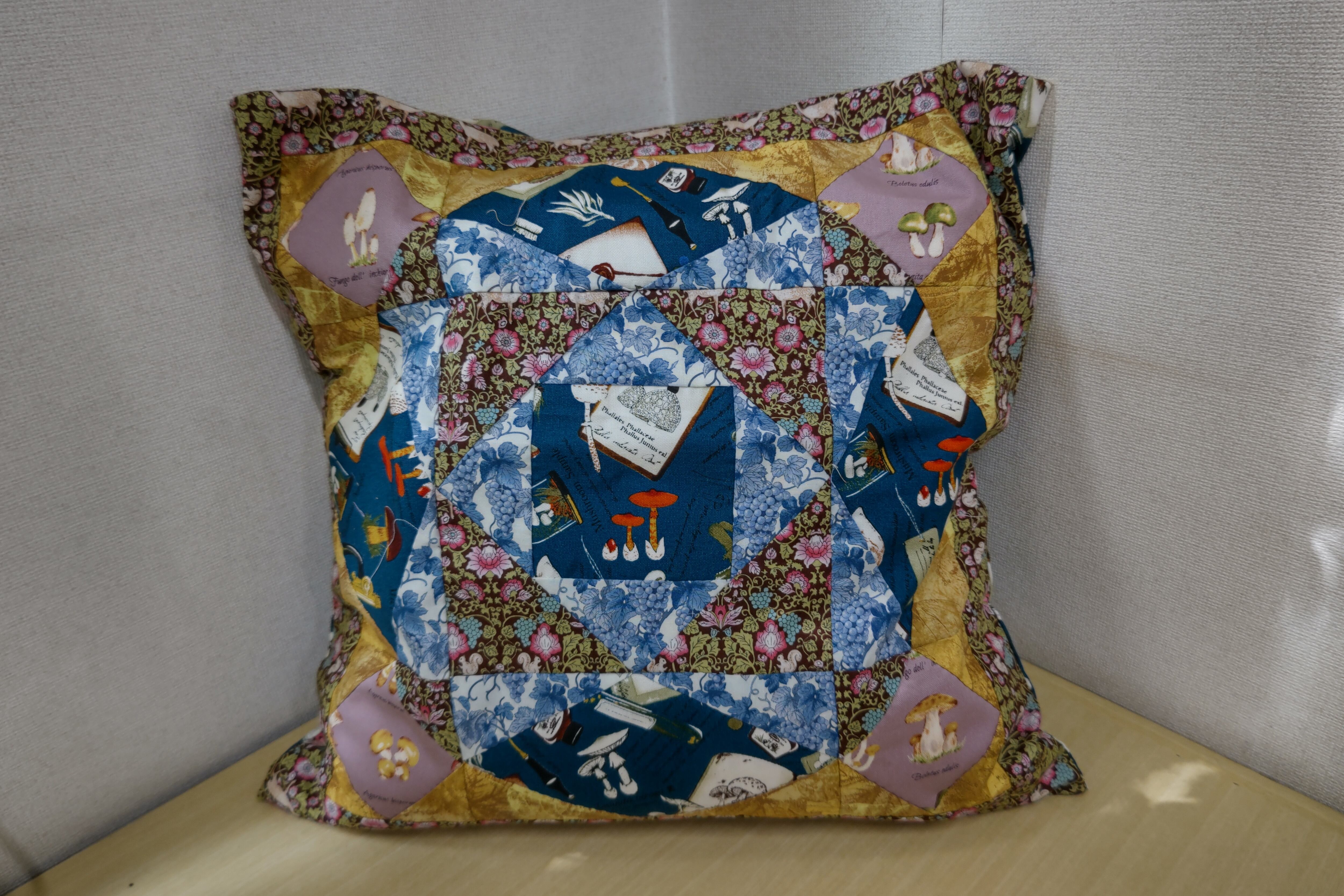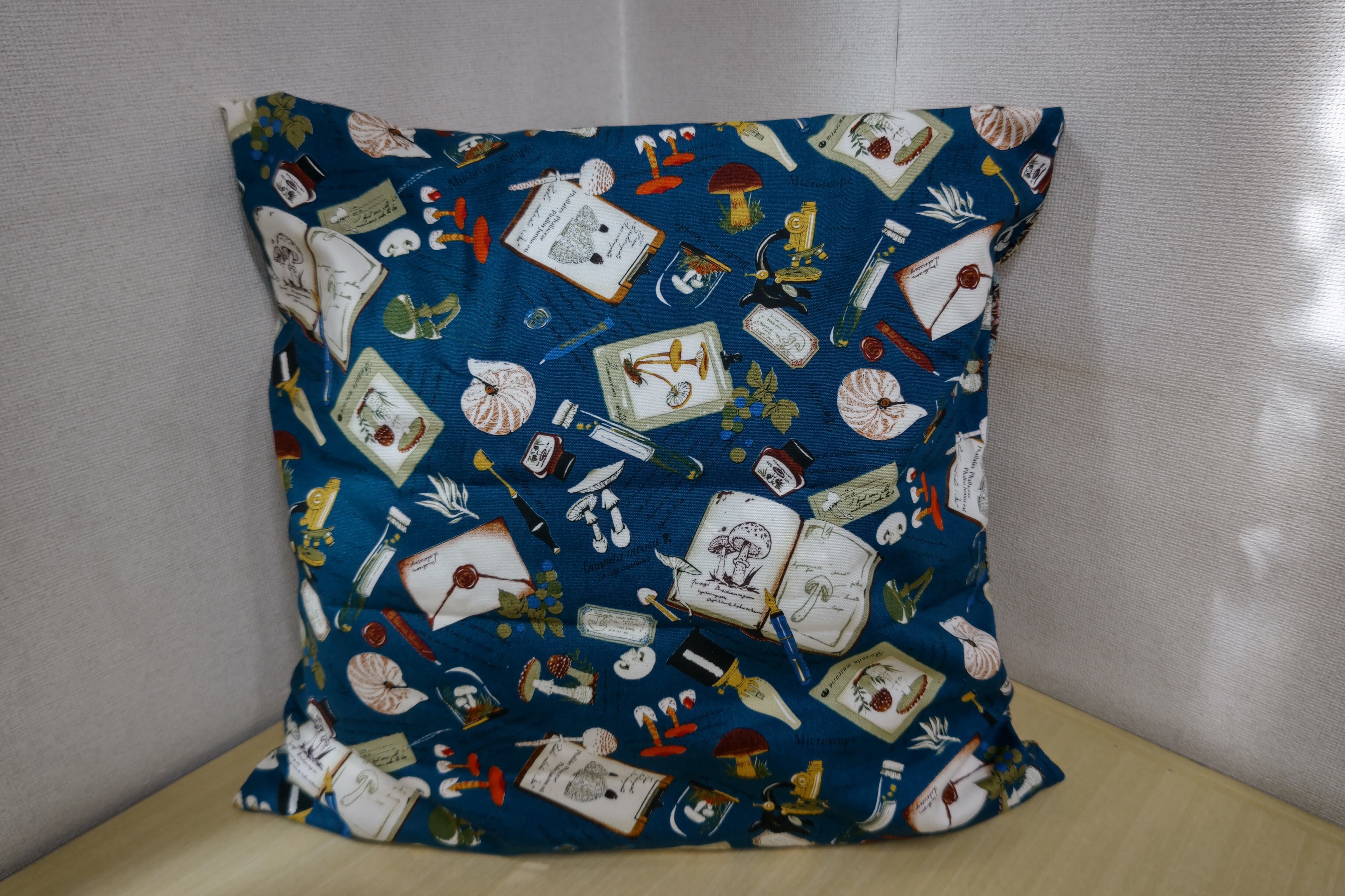 前回の作品同様、ボタンやファスナーを使わずに、クッションの中のウレタンなどを入れた際、余ったカバー部分を中に織り込むような形で使用します。