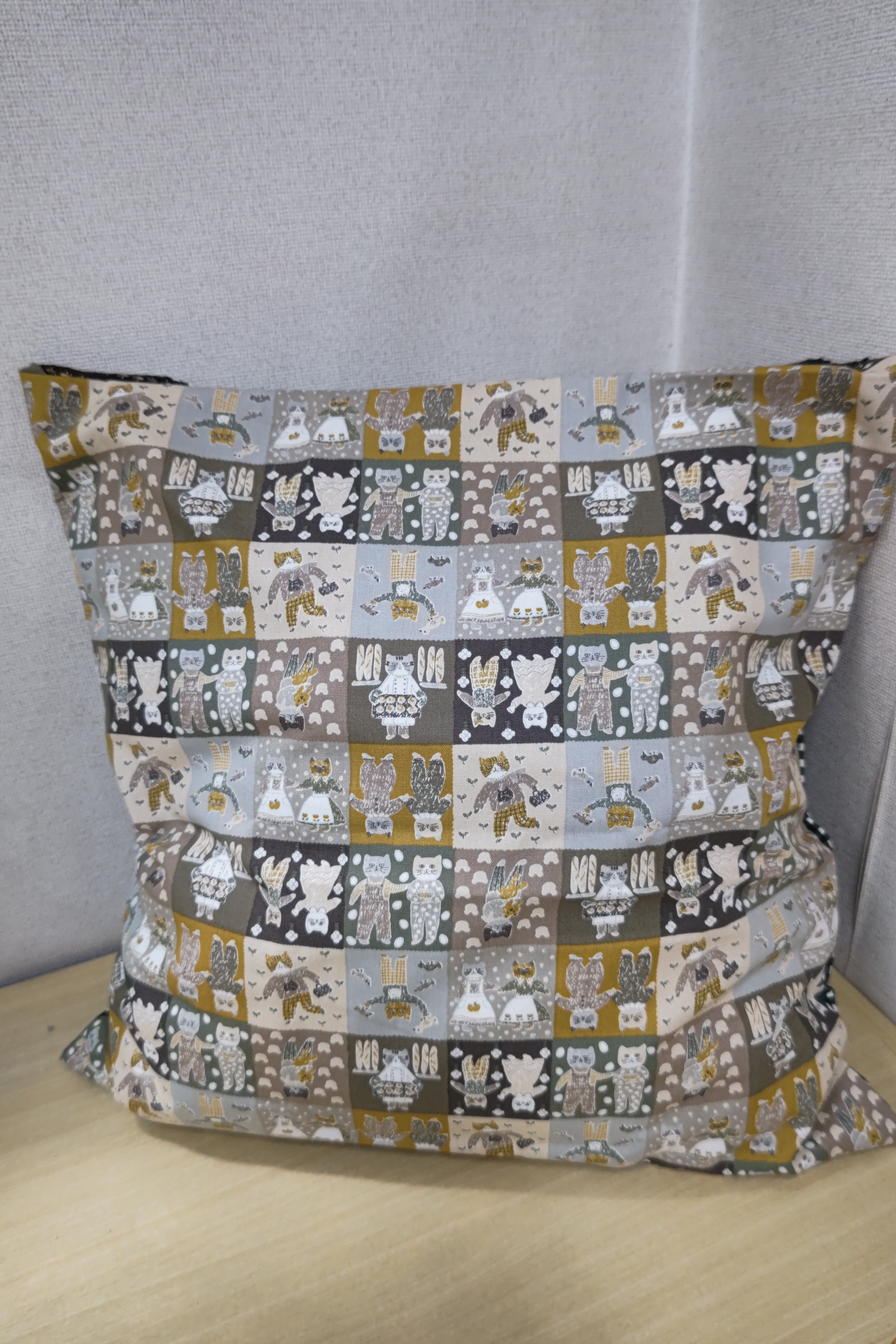 前回の作品同様、ボタンやファスナーを使わずに、クッションの中のウレタンなどを入れた際、余ったカバー部分を中に織り込むような形で使用します。