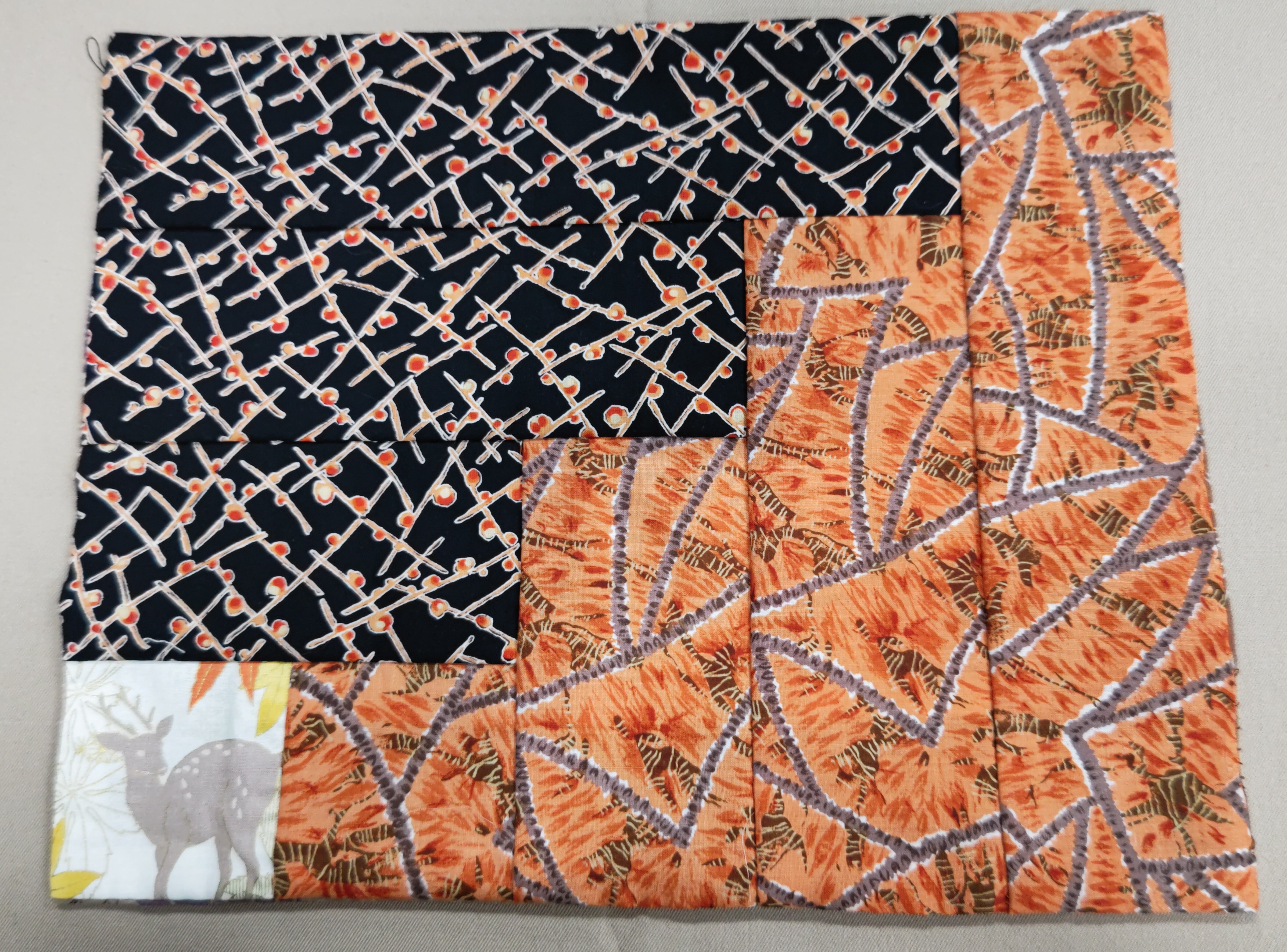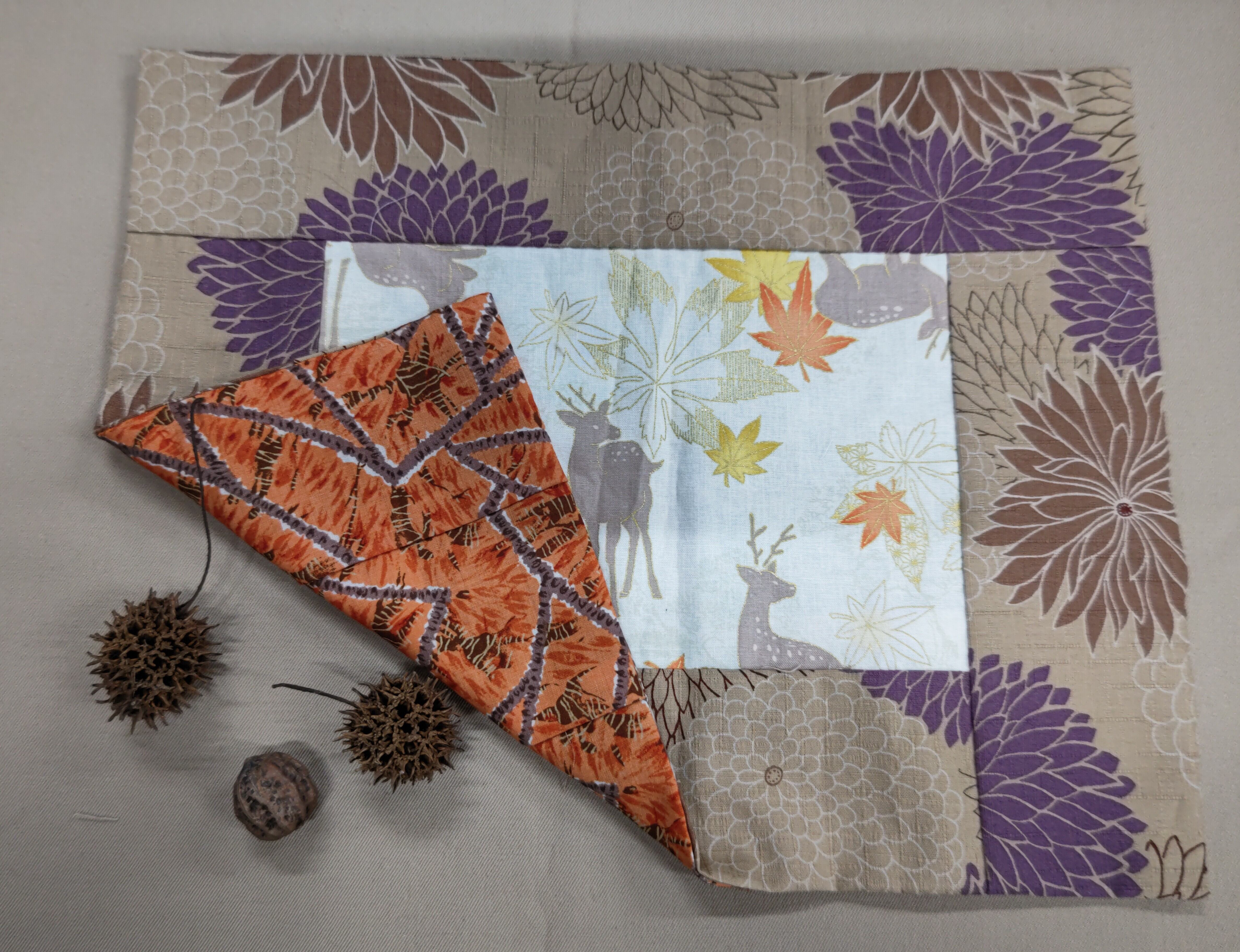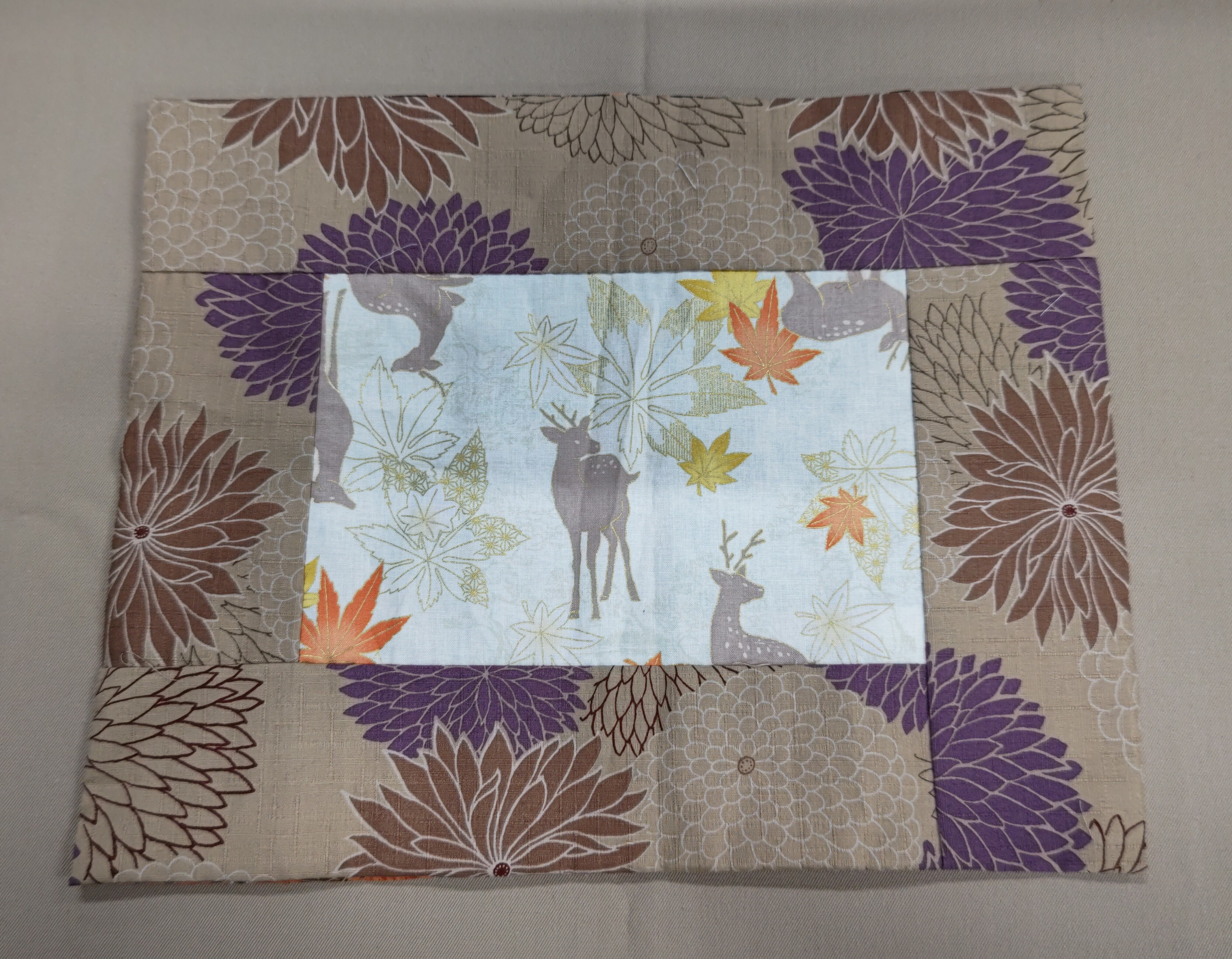 こちらは、秋の野山をイメージし、鹿の過ごす野山を大胆に2種類の柄の布地を配置して制作しました。
